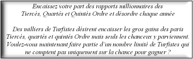 | Les Courses étant basées sur le pari mutuel, les rapports sont partagés entre tous les gagnants, nous ne pouvons donc accepter qu'un nombre limité de membres afin que chacun puisse encaisser de gros bénéfices chaque mois. |